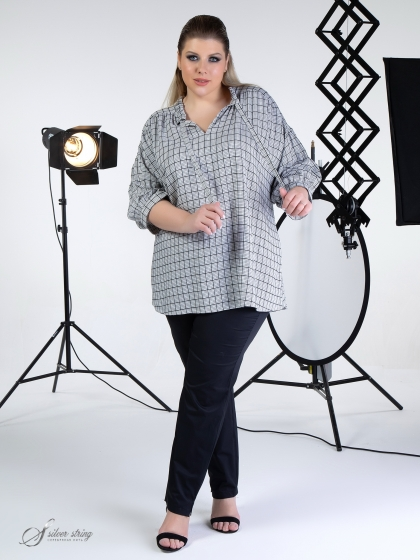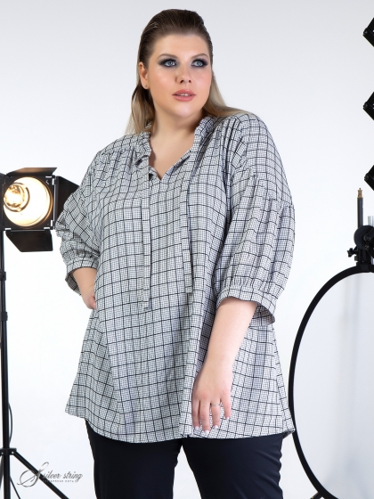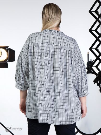 Оригинальная блуза в стиле «oversize» выполнена из смесовой натуральной ткани с рисунком в клетку. Изделие без застежки. Горловина округлой формы с У-образным вырезом по центру. По округлой части горловины проходит драпированная кулиса, сквозь которую продернут узкий галстук. Модель с просторным рукавом длиной за локоть, низ рукава присобран на манжету. На полочке и спинке обработана единая кокетка, переходящая на рукав. От линии кокетки заложена сборка. Модель отлично скрывает проблемные зоны, а оригинальный дизайн позволит чувствовать комфортно и стильно.