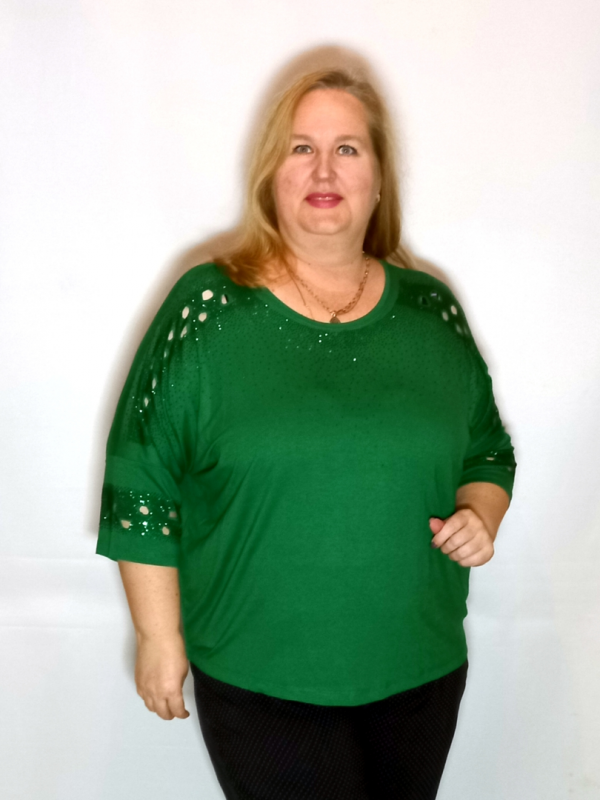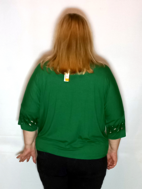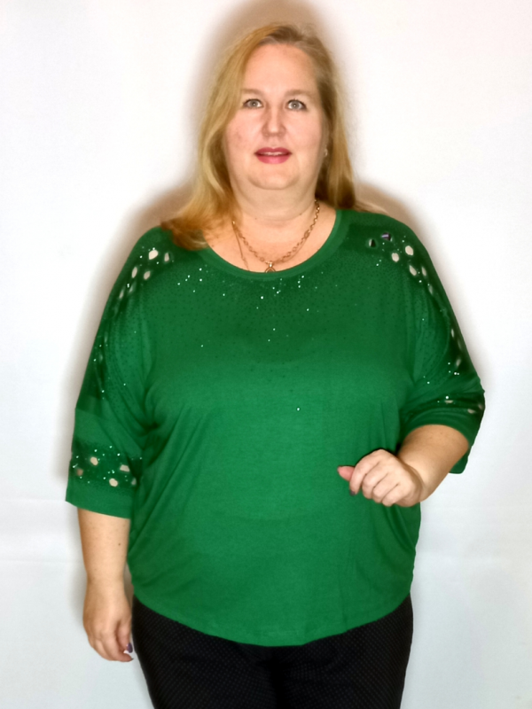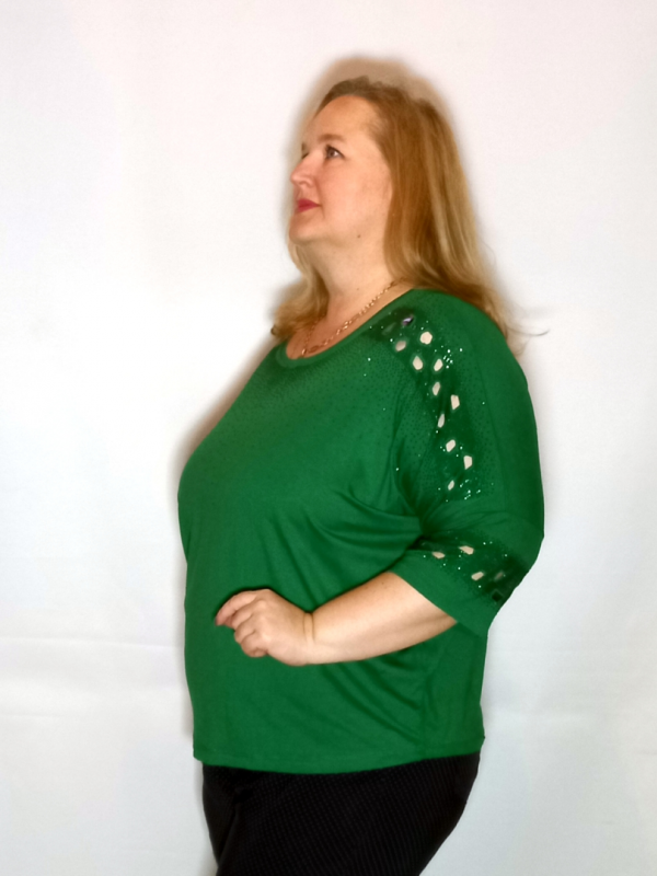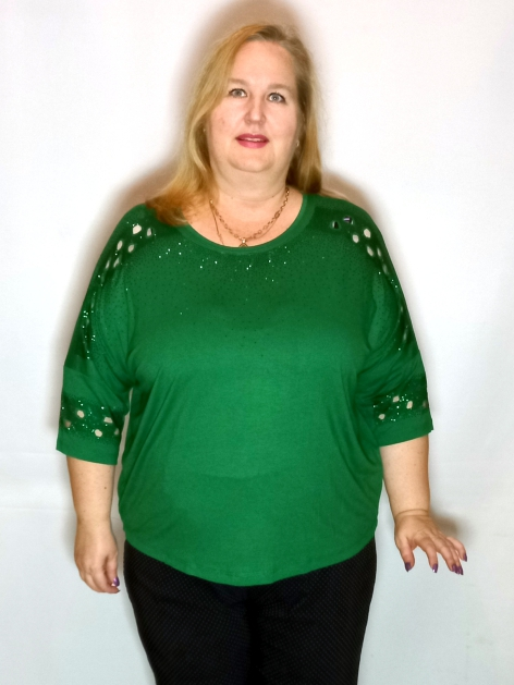 Рукав 3/4, спущенное плечо. По рукаву, по линии плеча декор россыпью термостраз и вырезанными участками.