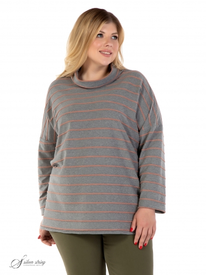Современный джемпер свободного силуэта выполнен из мягкого трикотажного полотна с фактурной выработкой контрастного цвета. Модель с удлиненной линией плеча и воротником - «гольф». Рукав длинный, суженный к низу. В оригинальном ключе решено оформление низа изделия и рукавов: срез материала отвернут на лицевую сторону и зафиксирован строчкой с отступом от края, что придает модели налет легкой небрежности. Крой модели отлично маскирует проблемные зоны, стройнит фигуру и дарит ощущение свободы и комфорта.