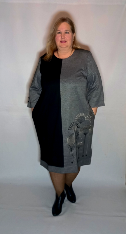 Платье выполнено из плотного трикотажа двух видов : однотонный и с рисунком. Трикотаж приятный, умеренно эластичный