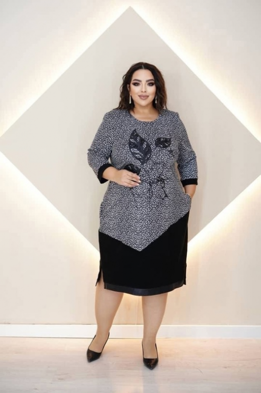 Элегантное платье выполнено из сочетания меланжевого трикотажа и трикотажа лапша.