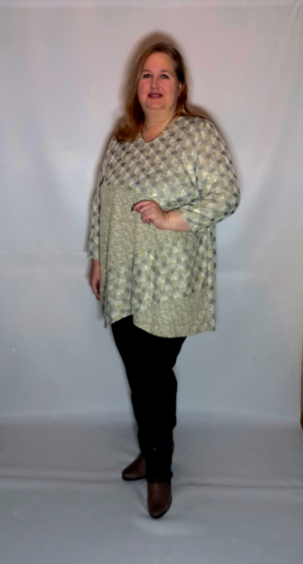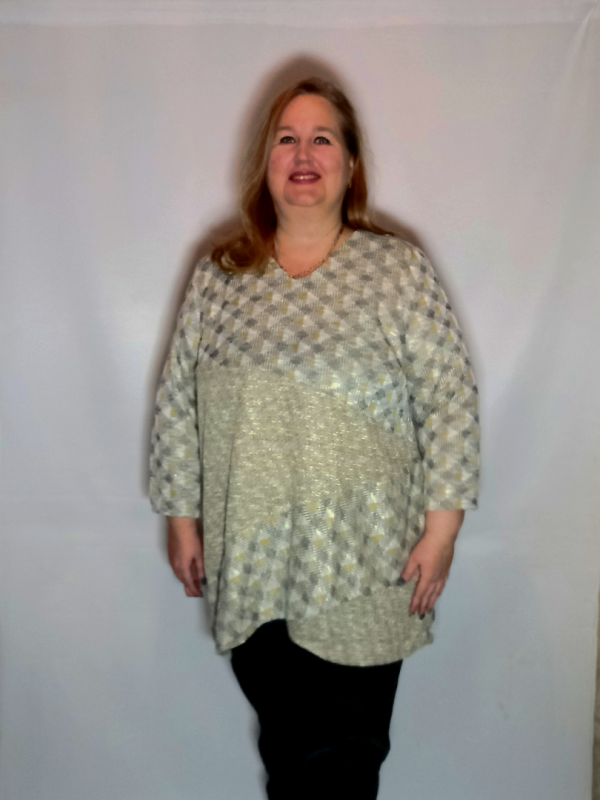 Комфортная в носке туника выполнена из мягкого, приятного на ощупь, эластичного трикотажного полотна с еле уловимым блеском (нить люрекс).