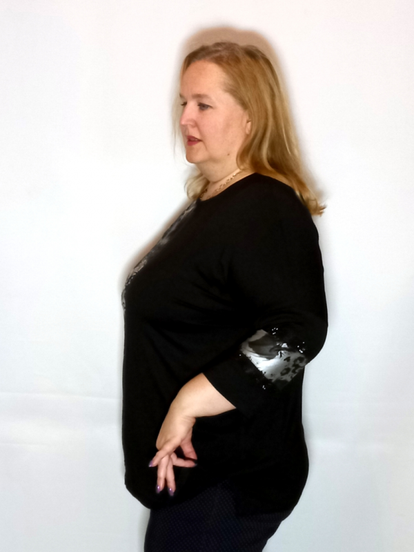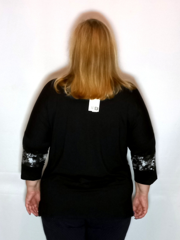 Рукав 3/4, спущенное плечо, декорирован вставкой из трикотажа с принтом и термостразами черного цвета