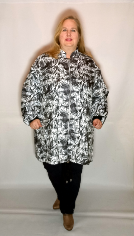 Модный плащ-пыльник выполнен из водоотталкивающей, гладкой с лицевой стороны, плащевой ткани с интересным принтом. Для отделки использовали эластичную тесьму с надписями.